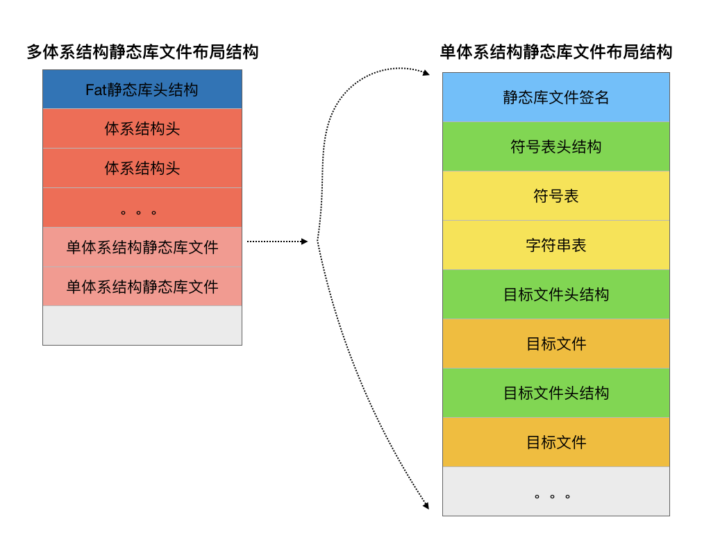 静态库的文件格式并不是mach-o文件格式的一部分。但是目前大部分操作系统中静态库的文件格式和生成标准都非常的相似。因为在iOS系统中可以支持x64和arm两种体系结构,因此iOS系统中的静态库文件中还可以同时支持多种体系结构的目标文件的集合,我们称这种静态库文件之为fat格式的静态库文件。下面分别展示的单体系结构下的静态库文件布局结构和多体系结构下的静态库文件布局结构: