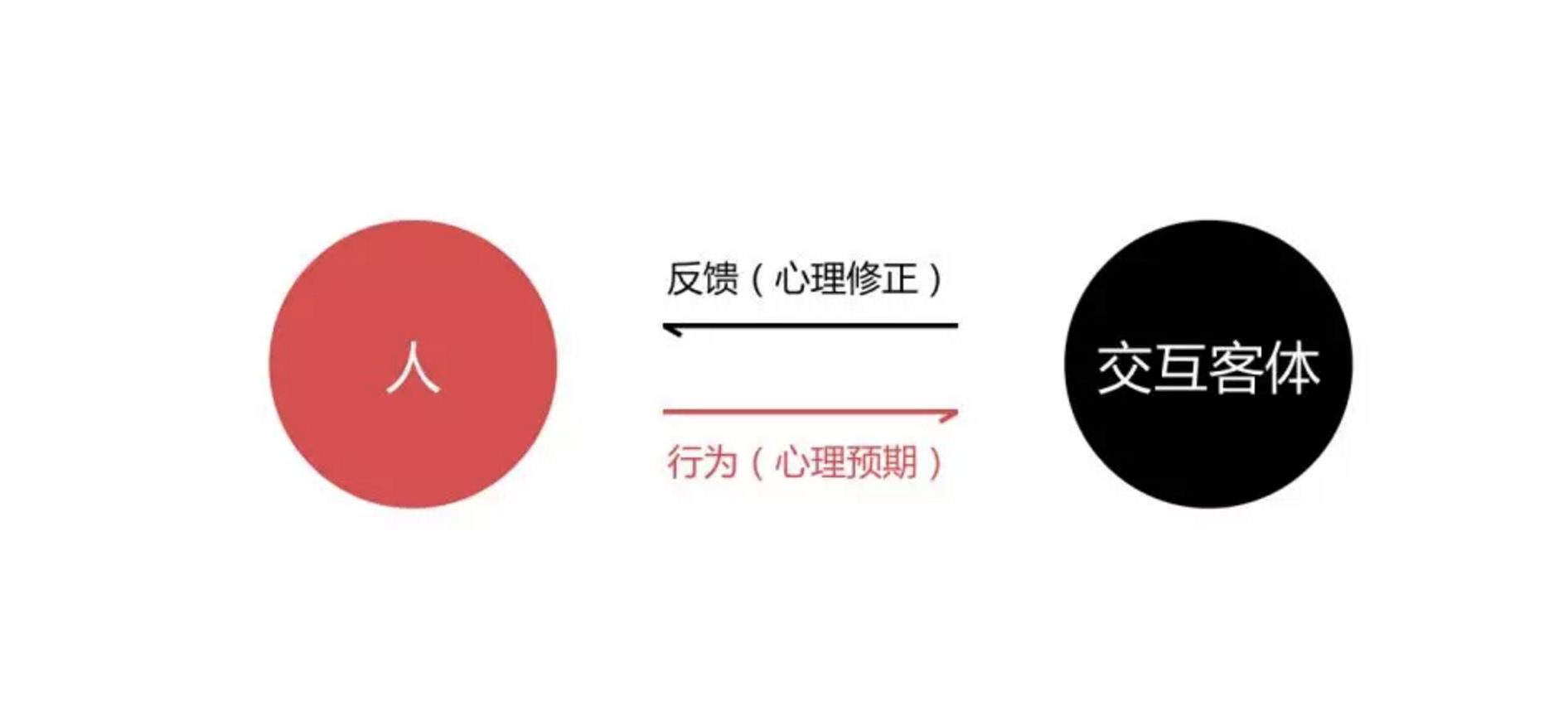 狭义的交互(Interaction)定义交互主体必须是人本身,而客体可以是产品,环境,服务等等,且不论交互客体是什么,只要主体是人,人和客体去进行交互的时候,一定是人带着一定的心理预期施加一个行为,然后客体会根据这个行为给与一个反馈(没有反馈本质也是一个反馈),而人会根据这个反馈是否符合预期去进行心理修正。如下图所示(红先黑后):