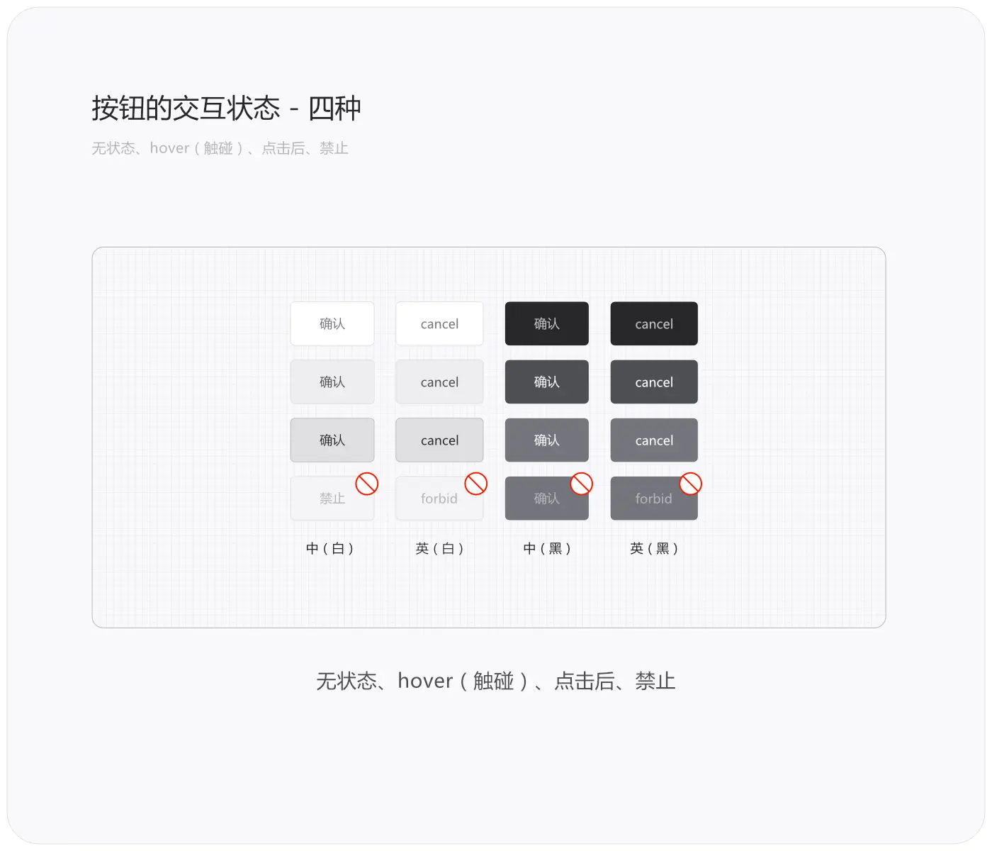 一个按钮的交互状态有四种,分布是:无状态、hover(触碰)、点击后、禁止。采用的配色可以递增(由浅到深),也可以递减(由深到浅)。按钮交互状态的配色深浅也是根据整体页面有关的。如果整体的调性偏深,配色可以递减(由深到浅),如果整体的调性偏浅,配色可以递增(由浅到深)。