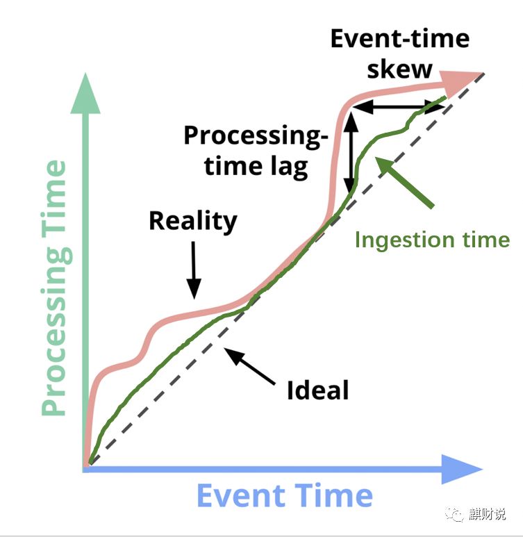 这张图,是来源于101里的一张经典图,可以从图中看出,理想状态下,事件时间和处理时间相同。也就是事件一发生就会立即被处理,但是这是也只是美好的愿望。现实中几乎不可能发生,这点大家应该很容易理解。