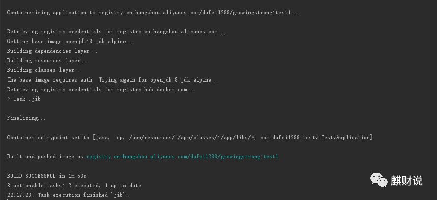 jib { from { //获取镜像 image = 'registry.hub.docker.com/openjdk:8-jdk-alpine' } to { //发布的镜像地址 image = 'registry.cn-hangzhou.aliyuncs.com/dafei1288/growingstrong:test1' auth { username = '111111' password = '111111' } }// 其他的一些配置// container {// jvmFlags = ['-Djava.security.egd=file:/dev/./urandom', '-Duser.timezone=GMT+08']// mainClass = 'example.jib.MainClass'// args = ['test]// ports = ['8080']// }}