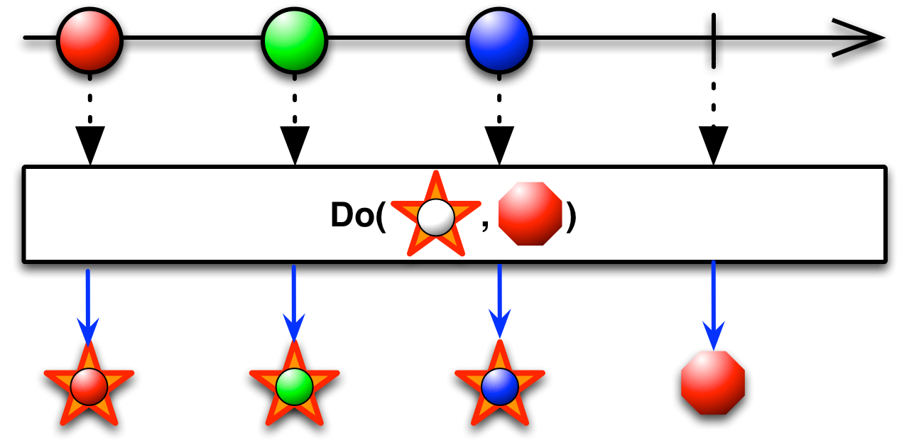 RxJava中有许多doXXX操作符。这些操作符一般是用来注册一个Action,这些Action会在XXX事件发生时调用。比如doOnSubscribe会在Observable被subscribe()时调用。下面这张图是官方描述的Do的执行时机: