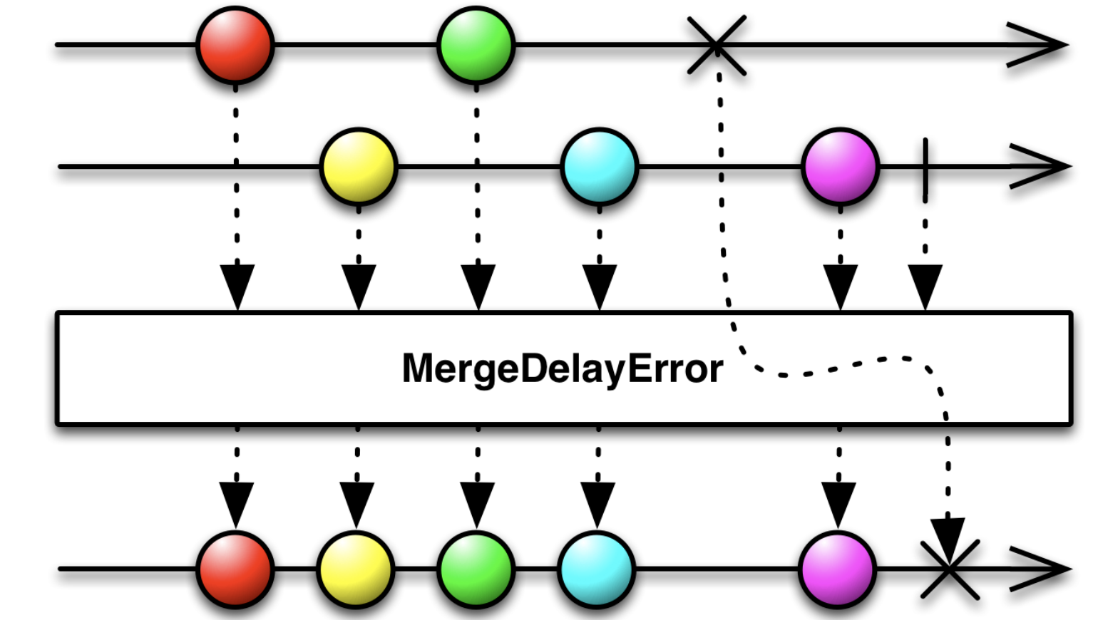 merge类似于zip, 不过它不会做数据的转换操作,只是简单的按照顺序merge多个Observable。不过当任意一个Observable出现error时,都会终止merge操作。如果不希望这种处理,可以使用mergeDelayError,当一个Observable出现错误是不会