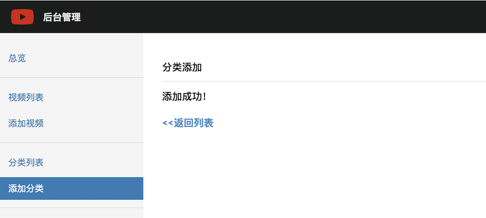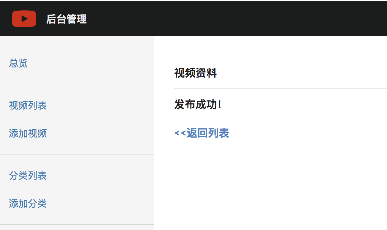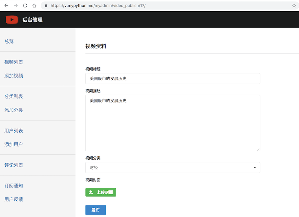 填写后,点击发布,django将通过UpdateView自动为你更新视频信息。并通过get_success_url跳转到成功页面myadmin:video_publish_success,它的路由是
