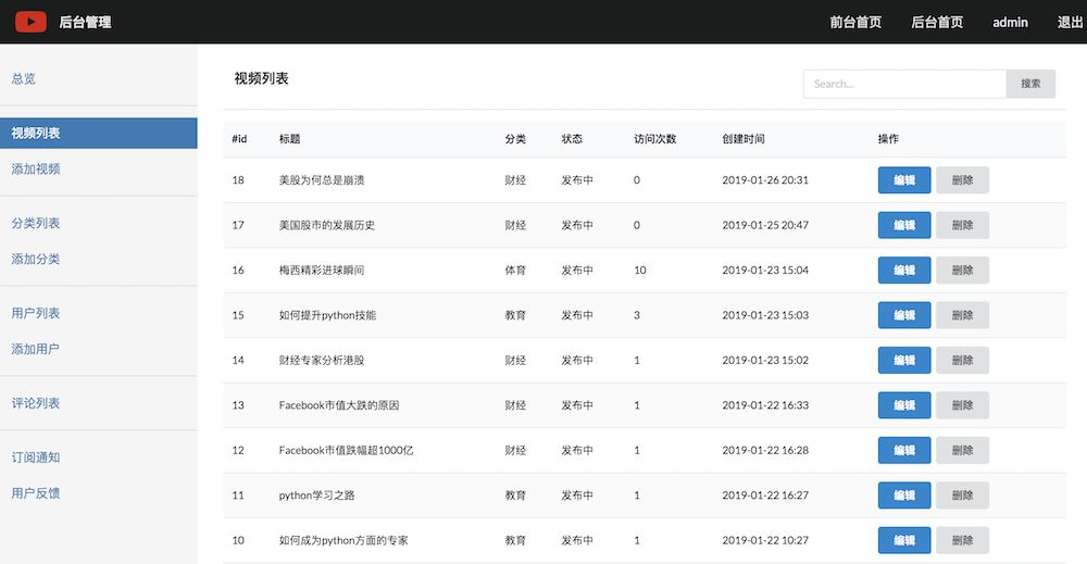 这里继承了ListView来显示视频列表,并通过get_queryset实现了搜索功能,通过get_context_data()实现了分页功能。