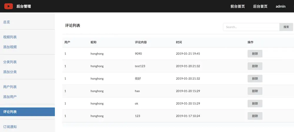 下面我们继续实现删除功能,该功能比较简单,只需要通过ajax将video_id传给删除接口即可,ajax的代码位于static/js/myadmin/comment_list.js,删除评论的接口是api_comment_delete,最终会调用到comment_delete,代码如下