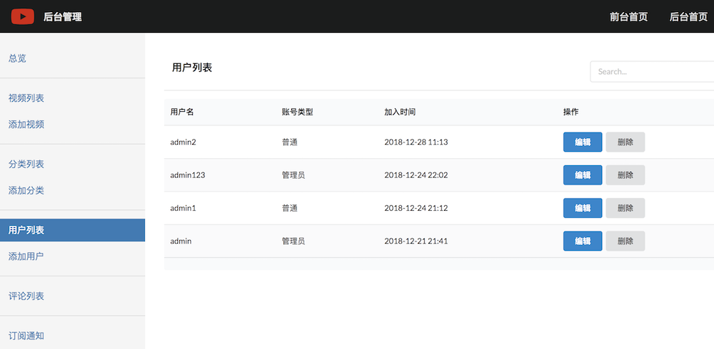 用户管理功能,包含用户添加、列表展示、编辑、删除四大功能。下面我们一一揭晓。