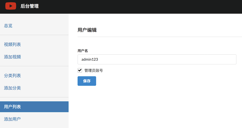 这是一个普通的视图类,通过get()和post()来完成用户添加的功能,get里面负责页面的展示,post里面负责逻辑处理。在get中,初始化form为UserAddForm,因为添加的用户是有类别的,所以我们在UserAddForm中应用了is_staff字段来表示管理员。在post中,我们通过user.set_password(password)来设置新密码。user.save()来保存记录到数据库。保存成功后会跳转到myadmin/user_add_success.html页面。