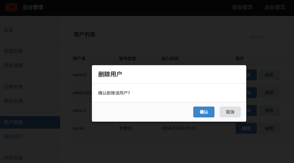 当你点击删除按钮的时候,会弹出确认框让你删除。然后网站通过ajax调用user_delete来实现真正的删除操作,其中,ajax代码位于static/js/myadmin/user_list.js