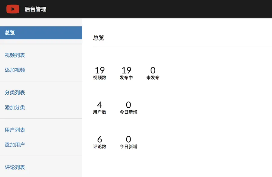 数据总览功能,是对网站中产生的数据进行一个统计,统计出视频数、发布数、用户数、评论数,等等。让管理者对网站数据有一个清晰的认识,做到心中有数。