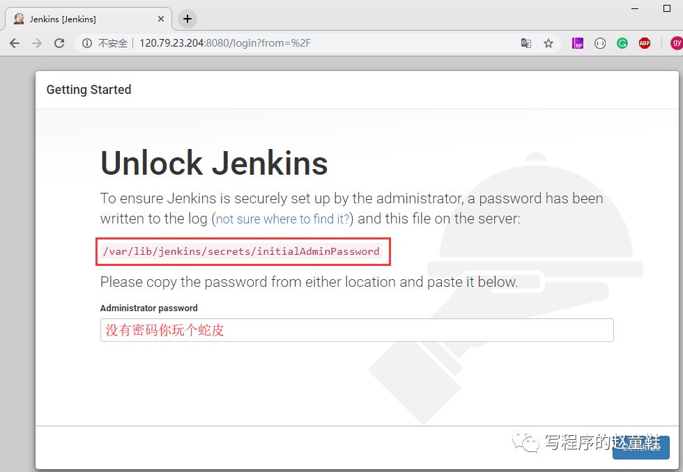 *“初始密码”在首次登陆时需要,Jenkins告诉我密码在该路径下【/var/lib/jenkins/secrets/initialAdminPassword】,使用"cat"命令即可得到密码