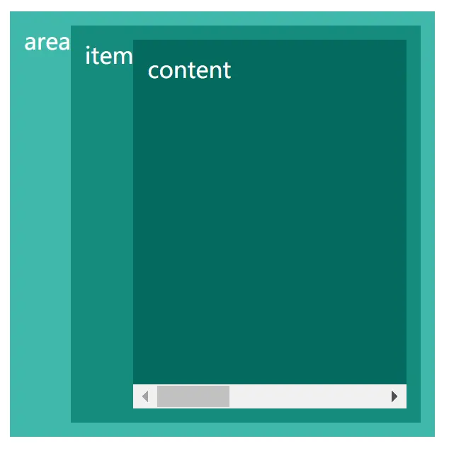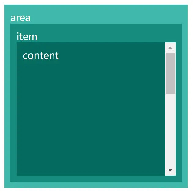 希望实现这样的效果:父容器area有一个指定的高度,且它是一个flex弹性盒子,它内部有一个子元素item,使用 flex: 1 指定了占满剩余空间,且item也是一个flex弹性盒子,它内部还有一个同样占满剩余空间的嵌套子元素nest-item,通过设置 overflow: auto 让它的内容超出后显示滚动条。效果如下:
