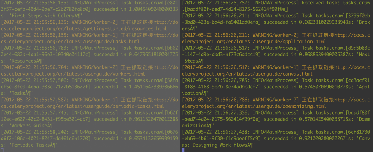 这个时候,我们运行给这两个worker节点发送抓取任务
