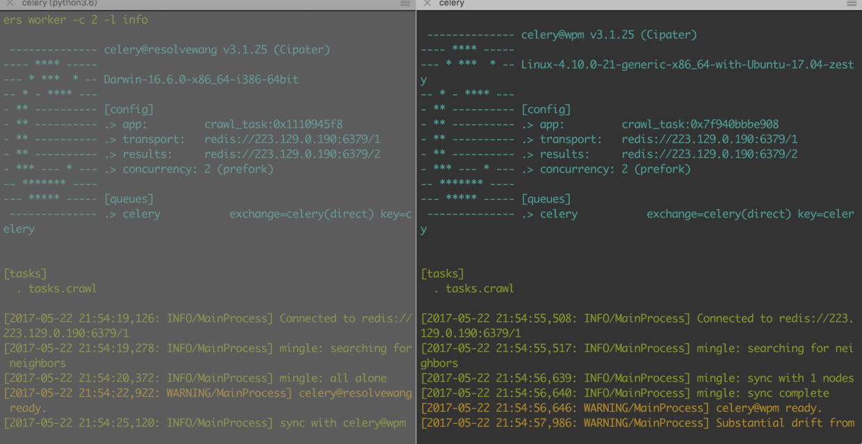 这里 -c指定了线程数为2, -l表示日志等级是info。我们把代码拷贝到节点B(节点名为wpm的主机),同样以相同命令启动worker,便可以看到以下输出