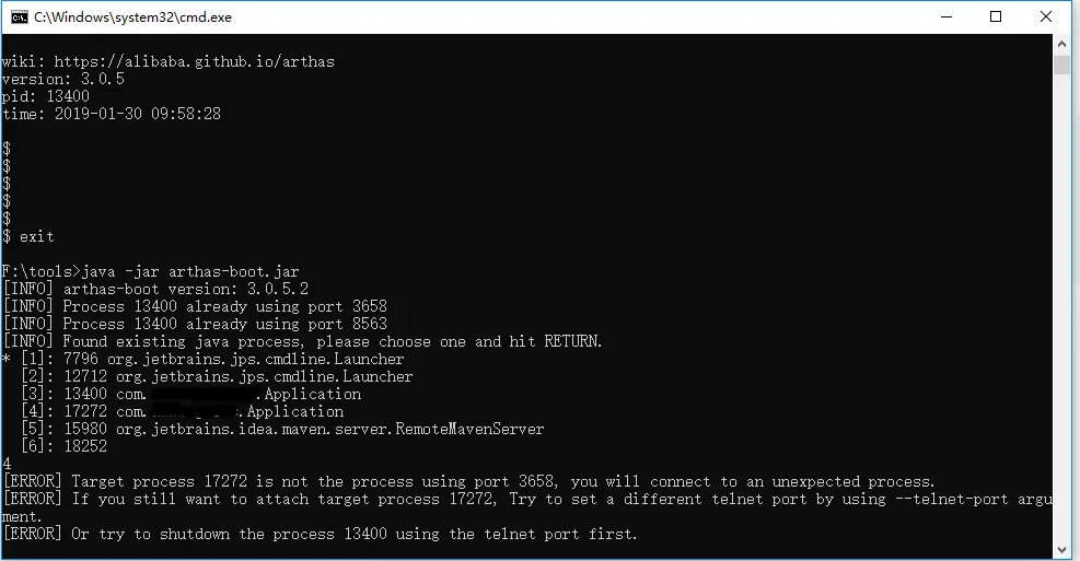 [ERROR] Target process 17272 is not the process using port 3658, you will connect to an unexpected process. [ERROR] If you still want to attach target process 17272, Try to set a different telnet port by using --telnet-port argument. [ERROR] Or try to shutdown the process 13400 using the telnet port first.