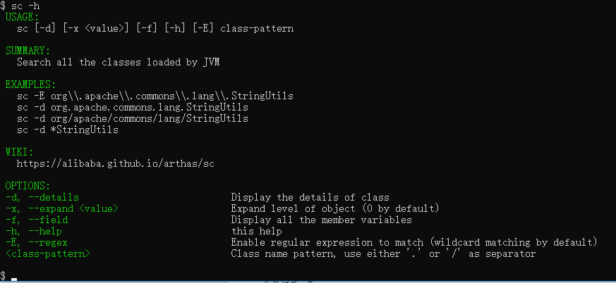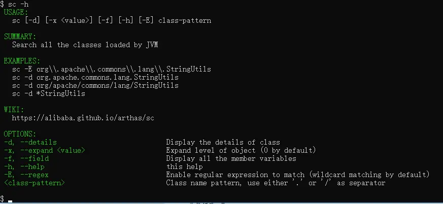 “Search-Class” 的简写,这个命令能搜索出所有已经加载到 JVM 中的 Class 信息. 对于不熟悉的命令在后面添加-h往往能得到更多有用的信息。 贴图仅此一次,后续类似命令不再赘述。