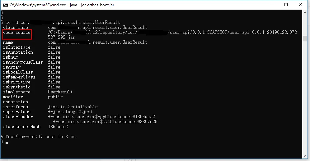 比如命令:sc com.sun.proxy.* 可以将全类名前匹配的类搜索出来。
