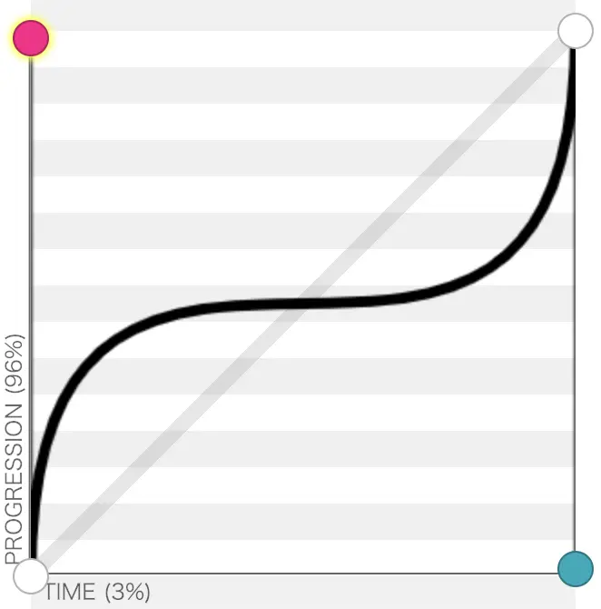 在 canvas 绘制中,我们借助 bezierCurveTo(cpX1, cpY1, cpX2, cpY2, x, y) 方法绘制贝塞尔曲线,由上图可见(歪脖 45 度查看更直观),两个控制点的横坐标应当设为矩形宽的中点,纵坐标跟随峰值变化即可。