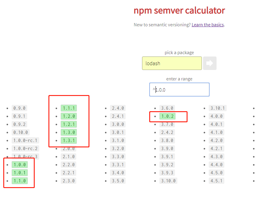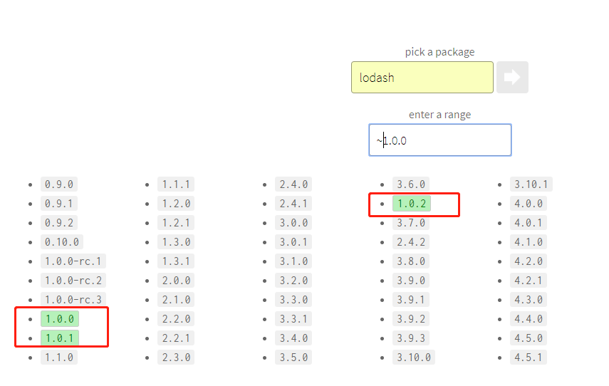 以loash这个包为例分别对^ 、~、 x.x.x三种情况进行计算 测试网址