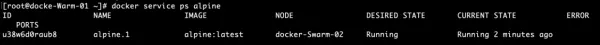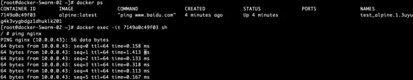 docker service create --network idig8-overlay --name alpine alpine ping www.baidu.com- 查看alpine所在的机器,进入容器,ping nginx