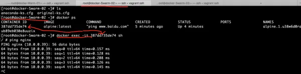 docker service ps alpine进入server02机器,ping 容器名称是nginx的 发现可以ping通