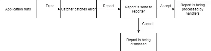 Catcher 报告流程是很容易理解的(参看下图)。Catcher 将错误处理程序注入到你的应用程序中,从而可以捕获所有未经检测的错误。一旦它捕获到错误,他就创建报告并将其发送到reporter 中。reporter 显示错误的相关信息并等待用户决策。如果用户接受报告错误,则处理程序(handlers)将处理该报告。