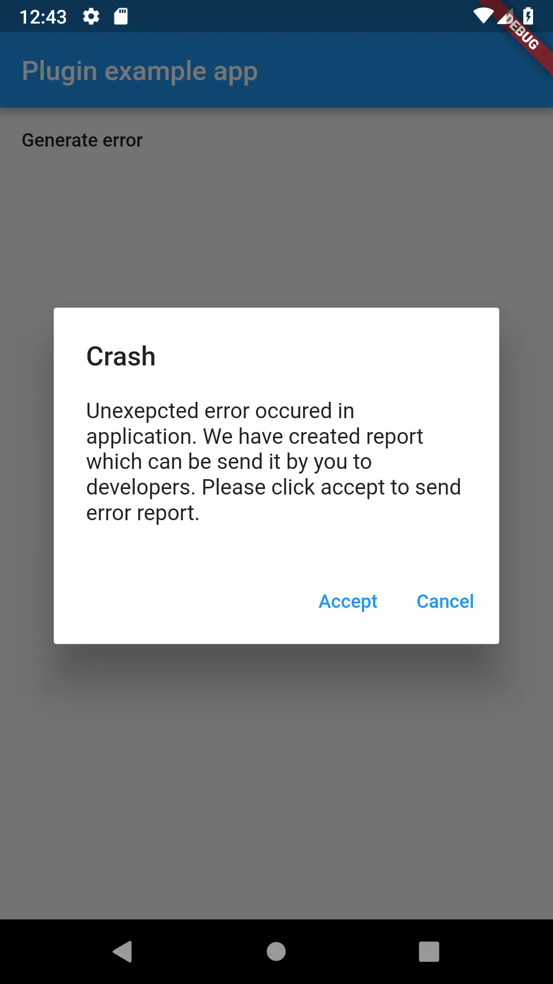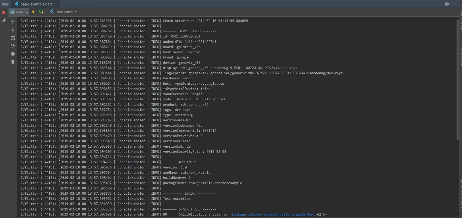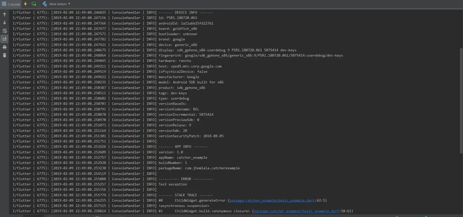 当你创建 Catcher 实例的时候,它将会启动你的根 Widget 并侦听应用程序中发生的任何错误。在调试模式下运行上面的代码,一旦有错误发生,将会显示一个对话框,用户可以在对话框中做出是否报告错误的决策。一旦用户接受报告错误,错误将由 Console 处理程序处理错误并将错误信息简单地打印到 Console 中。