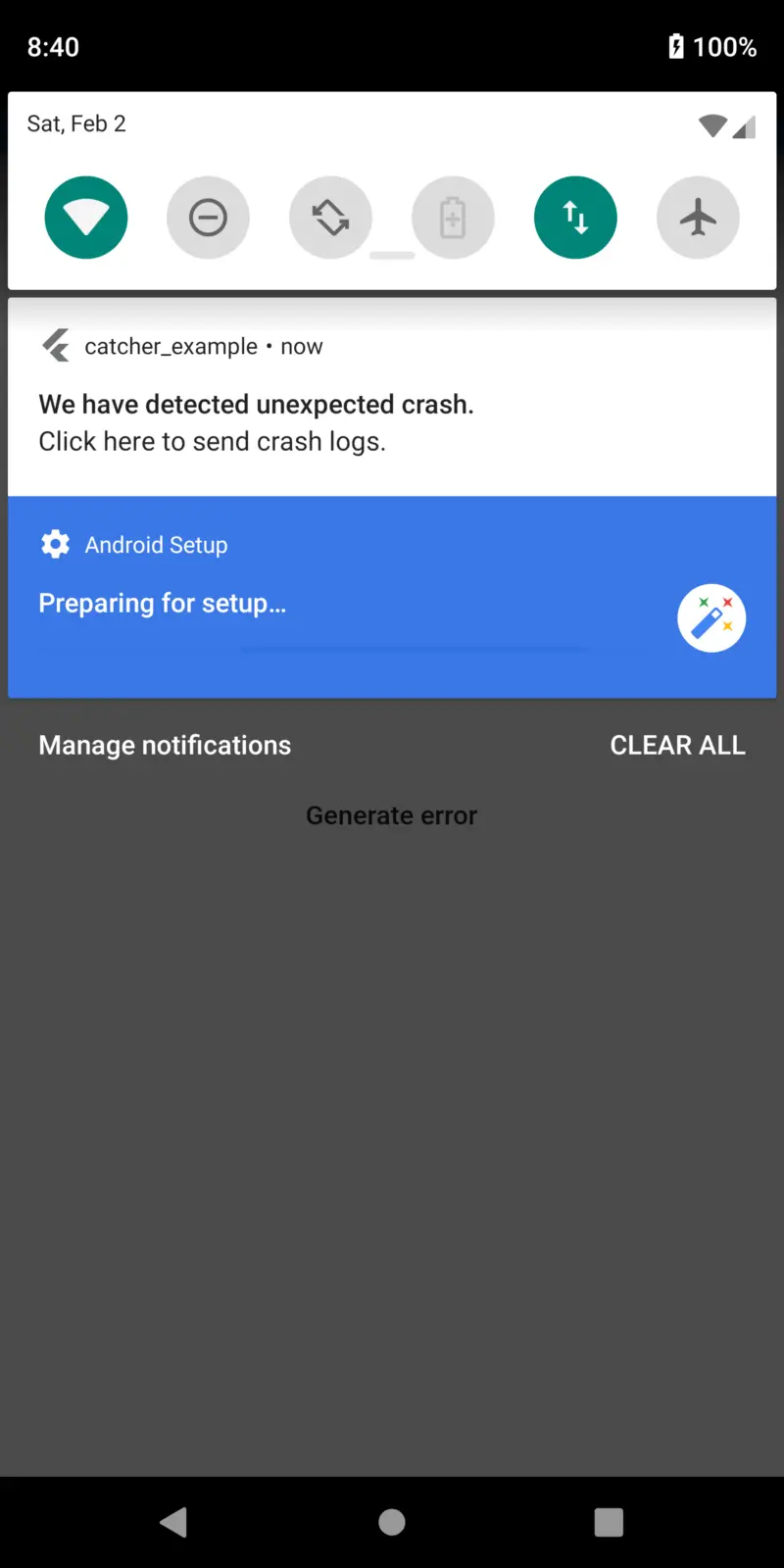 CatcherOptions(SilentReportMode(), [ConsoleHandler()]);通知报告模式显示用户本地通知。一旦用户点击了它,报告将被配置的处理程序接受并处理。