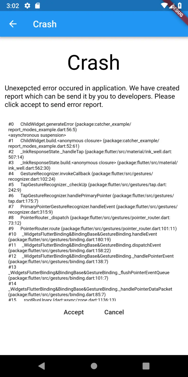 CatcherOptions(NotificationReportMode(), [ConsoleHandler()]);对话框报告模式会向用户显示一个对话框。对话框中有两个按钮:“同意”和“取消”。点击“同意”按钮将推送错误日志到处理程序,点击“取消”将解除报告。