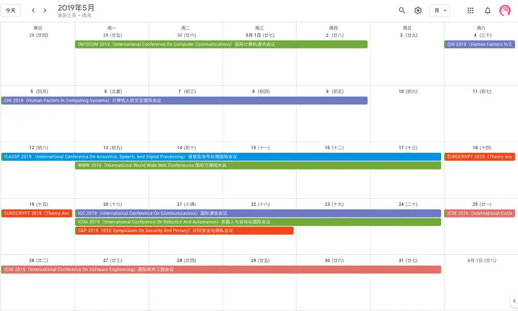 在梳理了目前计算机科学领域的会议后,筛选后全球各个机构主办的学术会议,有近 280 个,为了帮助大家查找方便,我们在 Google Calendar 中建立了一个共享日历,分类标注了所有重要的会议,也将持续进行维护。