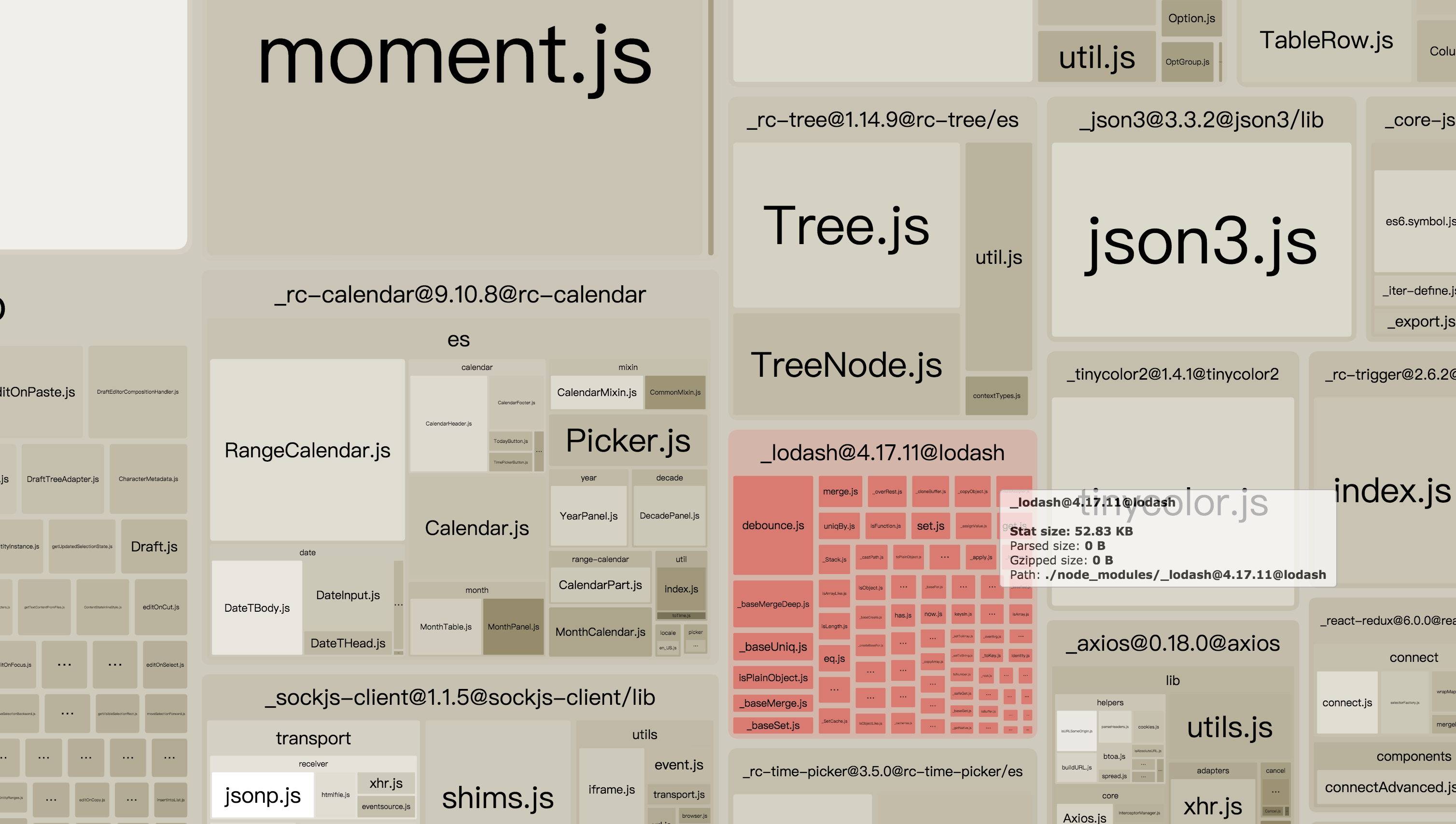使用webpack4 配置按需加载,减小lodash打包体积 雨田666 2019-02-14 2,660 阅读1分钟 结果对比: 578k --> 52K参考文章 : https://imys.net/20161217/webpack-use-lodash.htmlhttps://zhuanlan.zhihu.com/p/36280323webpack4不同于webpack3,配置参考 https://my.oschina.net/hyzccc/blog/1797358