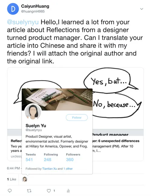 不管怎样,我很庆幸我有机会同时体验到这两种生活。虽然有时压力会很大,但从长远来看,1年半的产品经理经历会比我继续做一年半的设计师更能让我成为一个更好的设计师。