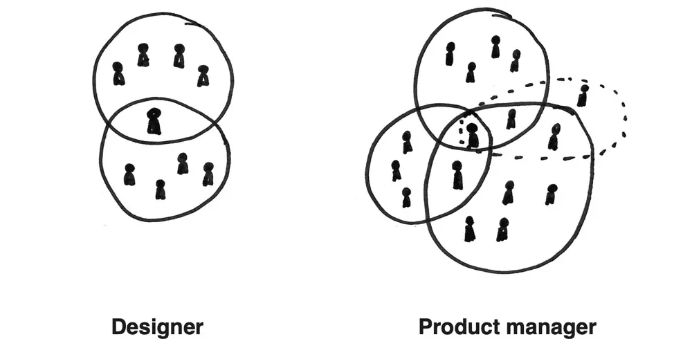 一个产品团队规模因公司而异。在大公司,在一个业务单元中有多个产品经理,产品经理可能也需要与其他产品配合一起工作。在小公司,产品经理可能是会与创始人一起合作。然而,产品通常只是管理产品,他们有时可能会感到孤立和孤独。他们把一天中的大部分时间都花在各种不同的功能上,而设计师一天的时间起码是坐在设计师中间一起工作。