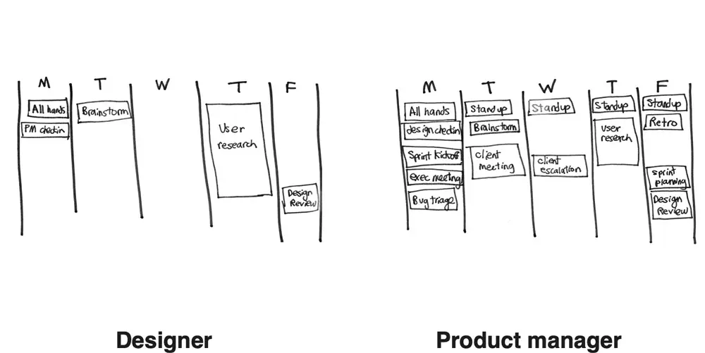 作为产品经理,我的时间则恰好相反,80%的时间是确定的,只有20%的时间不确定。作为一线产品经理,我参加了敏捷开发过程中的所有产品交付会议:站立会,sprint规划会议,sprint启动会议,还有项目回顾会议(译者注:sprint是敏捷项目管理的一种方式,具体的内容可以自行查阅资料,我就不展开说了)。为了满足客户的需求,我每两周还需要查看用户数据和业绩情况。此外,像客户演示和规划研讨会这样的一次性活动会出现在我的整个月的日历上。为了参加所有这些会议,同时还要完成自己的工作,我需要非常严格的管理好自己的时间。
