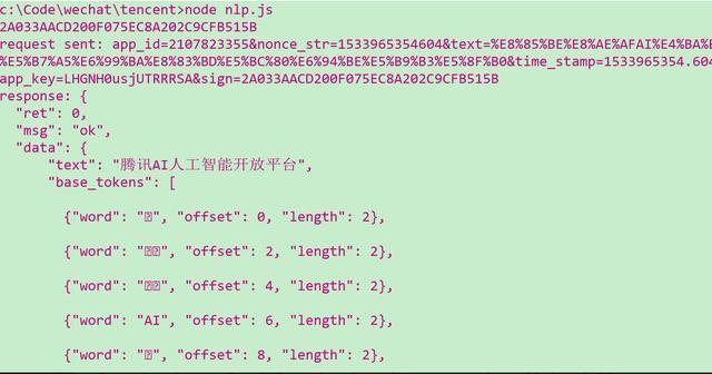 使用命令行 node nlp.js即可消费该API并查看结果: