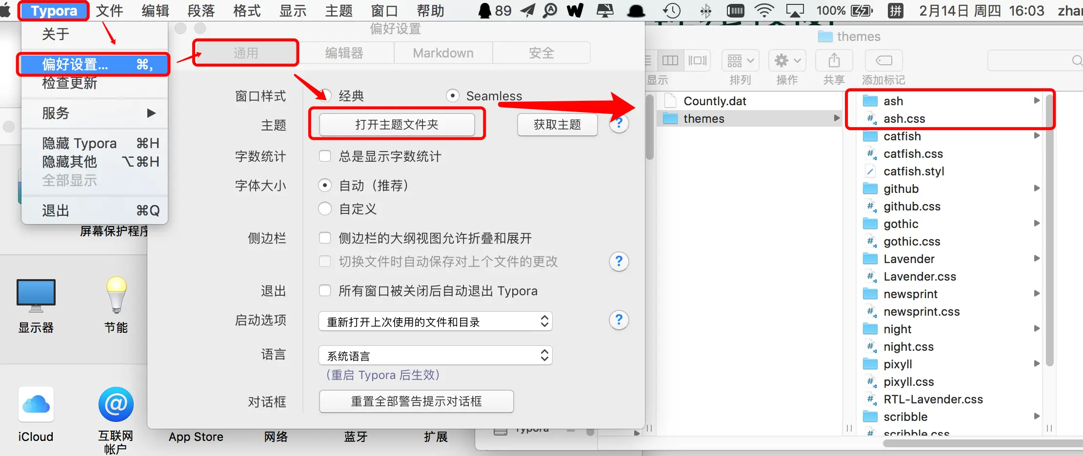- 打开typora的系统偏好设置/通用/打开主题文件夹,进入主题文件夹