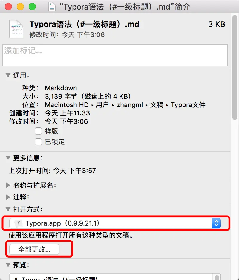 .md格式的文件- 右键/显示简介/打开方式/选择Typora.app /全部更改 (如下图)
