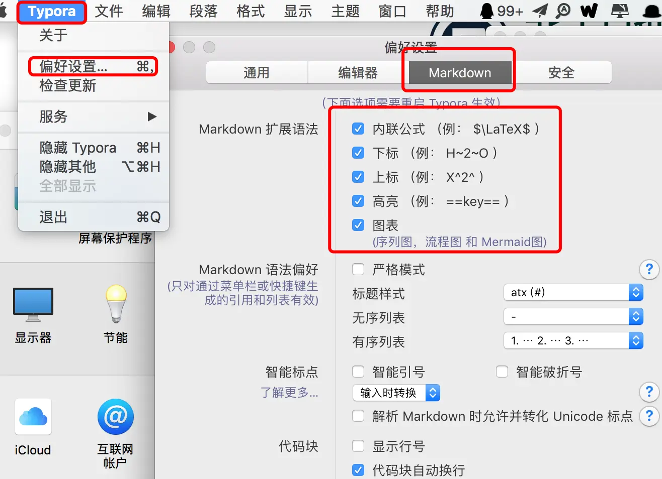 打开Typora的系统偏好设置/Markdown/选中希望展示的语法规则