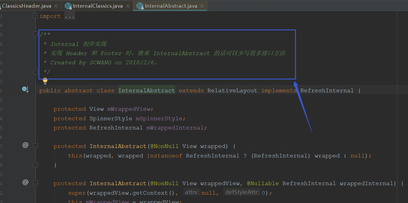 我们看到ClassicsHeader实现了RefreshHeader接口, 但是继承的却不是基本布局, 而是一个自定义的布局InternalClassics<ClassicsHeader>.