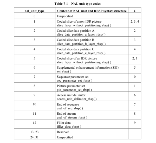 其中nal_unit_type是我们关心的字段,该字段标识了当前NALU的类型,我们可以通过将NALU中第一个字节&0x1F的方式来得到NALU类型。NALU类型的具体定义如下图所示: