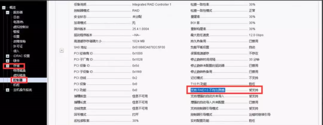 打开iDrac 点开存储-控制器,看自己的阵列卡是否支持RAID 10不均匀跨越。如果支持的话就是支持RAID 10 E了,见下图: