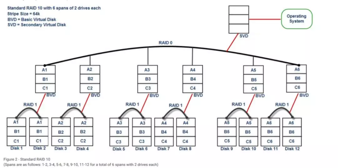 比如12块硬盘组RAID10,设置为6个SPAN,每个SPAN两块硬盘情况如下