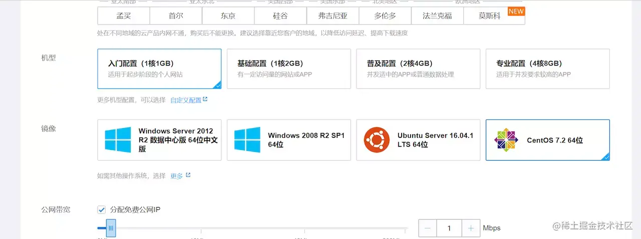 我购买的是腾讯云服务器,购买服务器阿里云、腾讯云其实大同小异,基本是一样的,步骤跟淘宝买东西是一样的,我因为是自己部署一些自己开发的东西,配置要求不高,所以都是最低配置,选择镜像是centos7.3,因为是部署一个小项目,配置要求不用很高,所以我选的是基本配置,如下图: