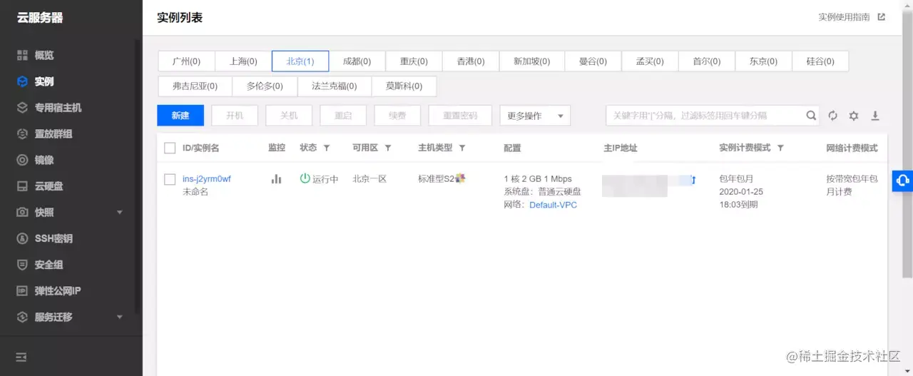 购买完后点击右上角控制台,进入控制台页面,点击实例,选择你购买服务器时选择的地域