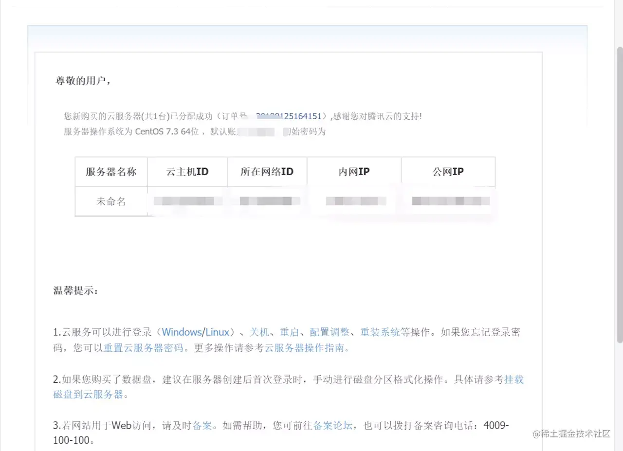 就会如上图显示,一个你购买的服务器的基本情况,然后你注册腾讯云账号市填写的邮箱里,腾讯会给你发一封你购买的服务器的基本情况