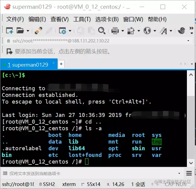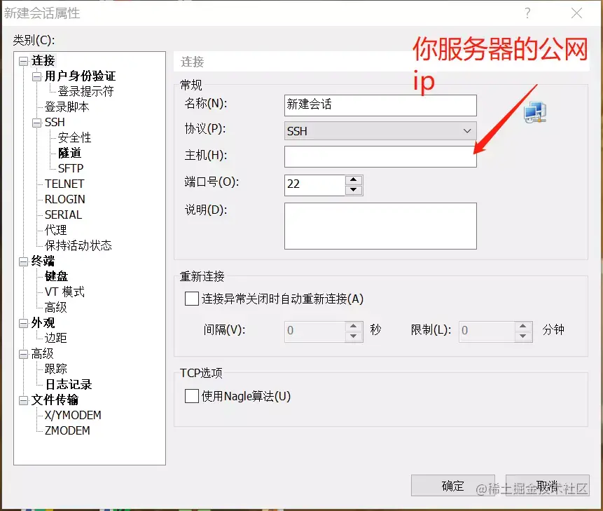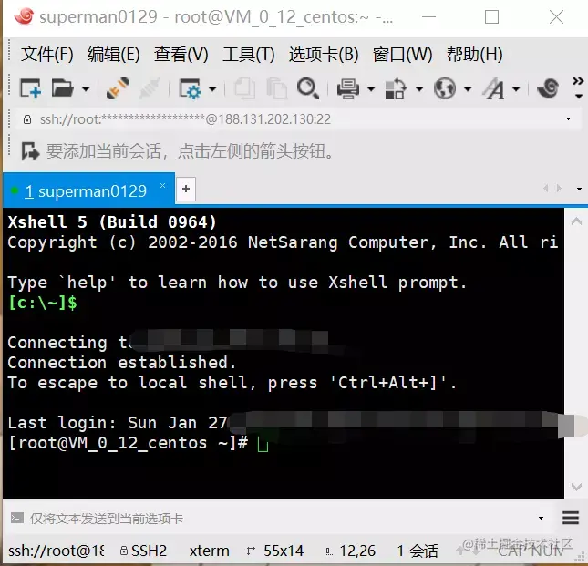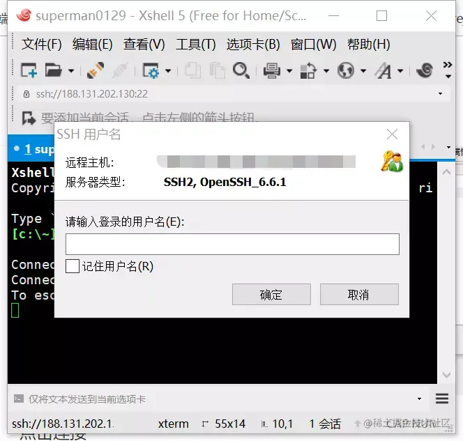 填写你服务器的公网ip,也就是你登录腾讯云后控制台实例中的那个公网ip,填写完之后确定,然后填写自己服务器的账户root(这个不需要你填写),密码(邮件中的密码,或者你重置的密码),填写完后确定,会出现如下图