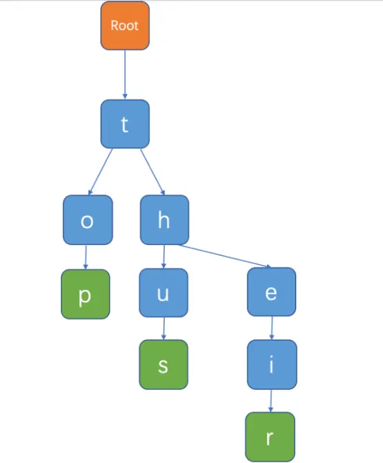 这些单词以从上到下的方式存储,其中绿色节点“p”,“s”和“r”分别表示“top”,“thus”和“their”的末尾。