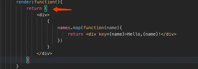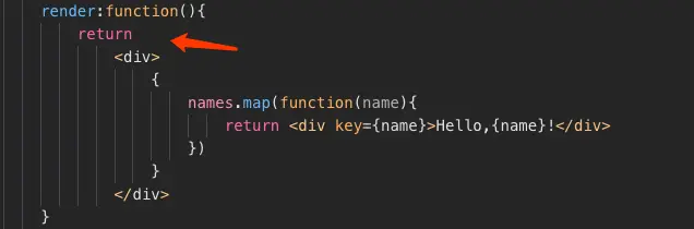 在我们注重格式化书写的时候,可能会在render函数中的return后进行断开书写,这样显得格式化更好些: