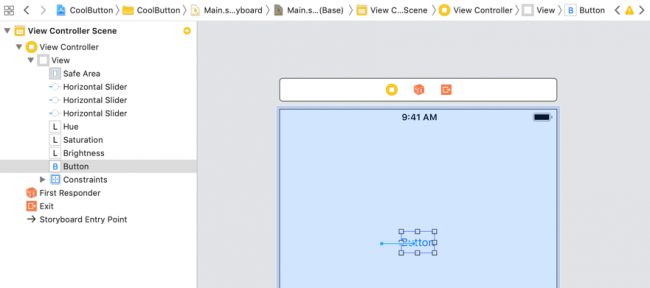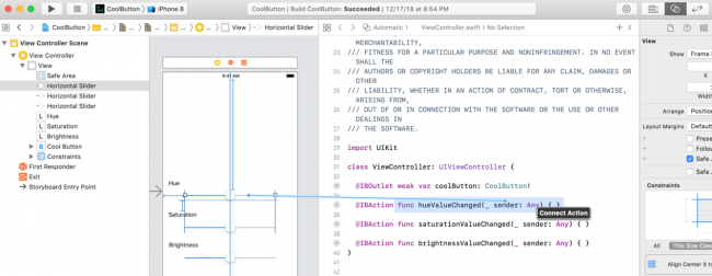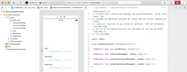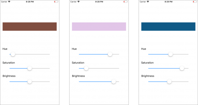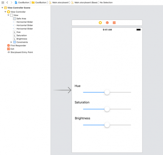 打开Main.storyboard以配置UI。 有一个视图控制器包含三个滑块 - 一个用于色调,一个用于饱和度,一个用于亮度。