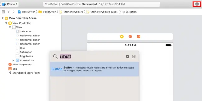 您错过了UIButton,因此请将其添加到屏幕顶部。 转到Object Library,键入UIButton,然后将其拖到屏幕中。